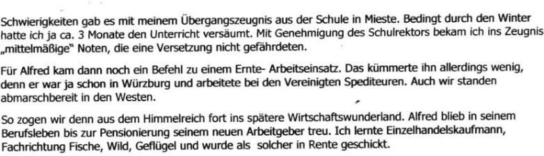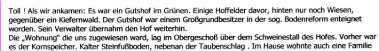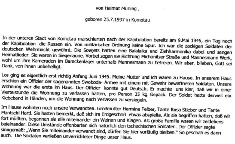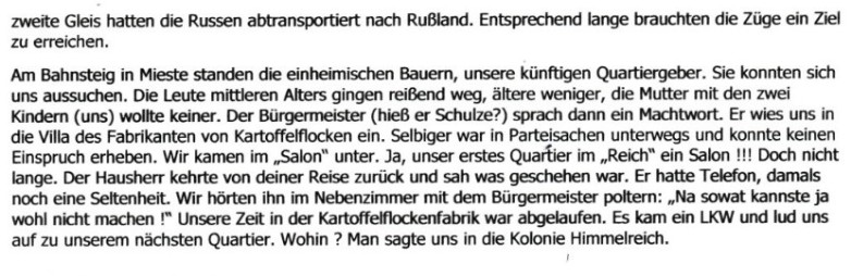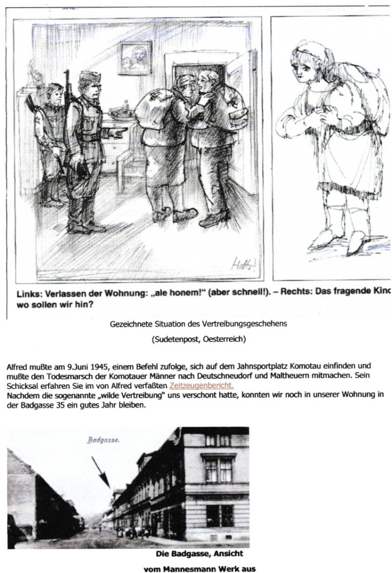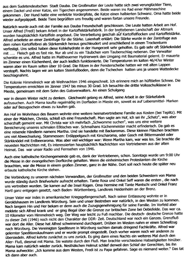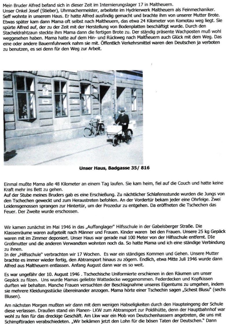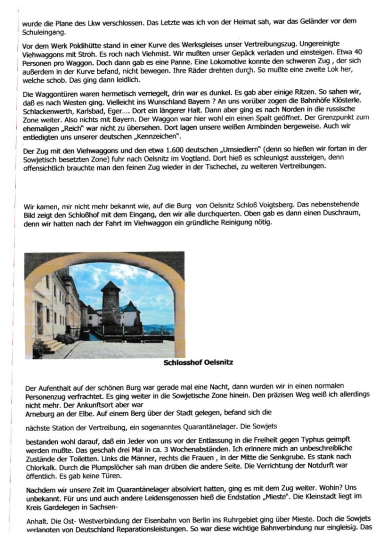Mama erhielt im Sommer die Aufforderung zu einem Ernteeinsatz auf dem Gutshof in Witschitz an der Eger. Mama und ich liefen zu Fuß über Trauschkowitz, Priesen und dem Spielhübl nach Witschitz. Vom tschechischen Gutsverwalter wurden wir sehr unfreundlich empfangen. Es waren noch mehr deutsche Frauen zum Einsatz kommandiert. Tags darauf, auf dem Felde (ich weiß nicht mehr , was geerntet wurde), nahm der Gutsvewalter "Rache" an den deutschen Frauen. Eine jede bekam unter Schimpftiraden Ohrfeigen. Ich war nicht dabei, aber Mama hat es anschließend erzählt.