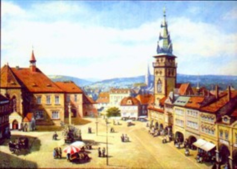 manchmal ist es nur eine verbreiterte Straße. Kirche, Rathaus und Kaufhaus sind die wesentlichsten Gebäude einer Stadt. Man legte Befestigungsmauern mit Toren und Türme an; deren Reste zeugen heute noch von der Wehrhaftigkeit. Schönheitssinn und praktisches Denken der Bürger schufen schöngiebelige Häuser mit Laubengängen, Brunnen und Denkmälern. Urkundenbücher und Bürgerverzeichnisse aus vorhussitischer Zeit sind Belege daür, daß die Deutschen in den meisten Städten in der Mehrzahl waren. Die Entstehung der Bergstädte geht ebenfalls auf deutsche Siedler und Bergleute zurück. Schon im 12. und 13. Jahrhundert erreichte der Bergbau eine hohe Blüte; Silber- und Golderze wurden abgebaut. Es entstanden Iglau, Kuttenberg, Graupen, Bergreichenstein und andere Städte im Erzgebirge, Böhmerwald, Egerland, Nordmähren und Schlesien. Im 16. Jahrhundert kamen weitere Bergleute ins Land, welche den Reichtum an Erzen erschlossen und wieder Bergstädte wie St.Joachimsthal, Sonnenberg, Sebastiansberg und Kupferberg gründeten. Nicht nur die Städte in den geschlossenen deutschen Siedlungsgebieten und den Volkstumsinseln, sondern auch dieselben im slawischen Siedlungsgebiet, wie Beraun, Deutsch Brod, Chotebor, Hohenmaut, Jermer, Jitschin, Kolin, Königgrätz, Königinhof, Melnik, Nimburg, Pisek, Pilsen,Taus und viele andere waren ursprünglich deutsch. Tschechische Gründung ist lediglich die Stadt Tabor. In den deutschen Medien werden zur Zeit die deutschen Ortsnamen unserer Städte in großem Maße durch die heutigen tschechischen ersetzt. Im Gebiet des Sudetenlandes waren deutsche Ortsnamen die Regel und die Städte und Dörfer waren von Deutschen bewohnt.